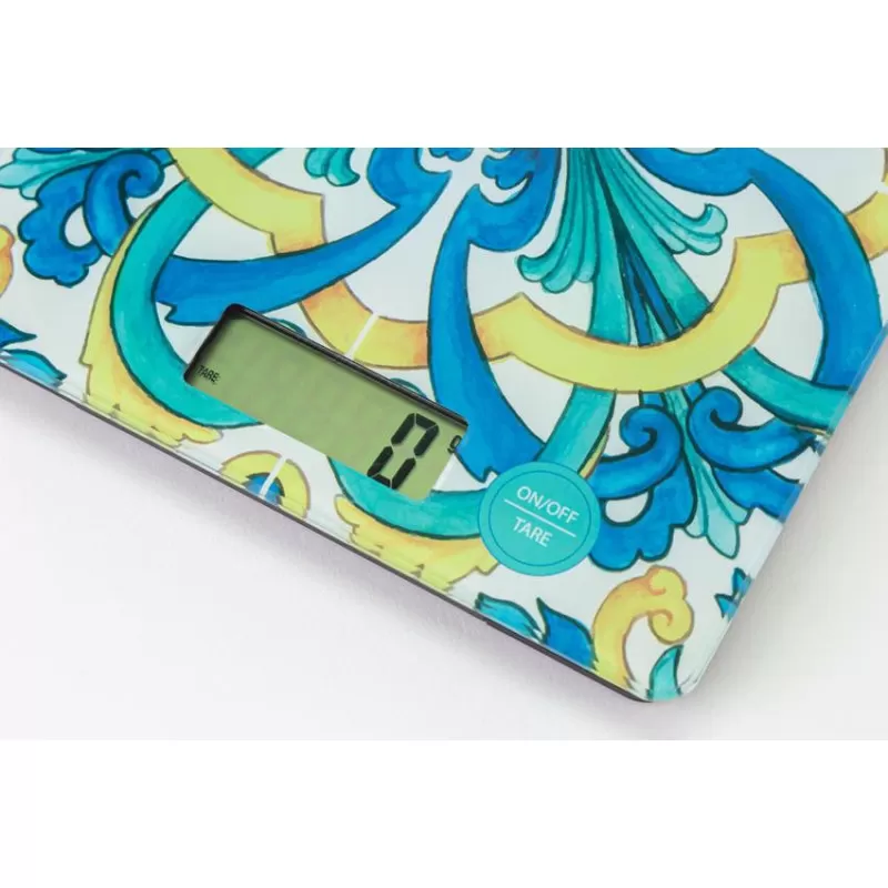 Bomboniera matrimonio utile 2022 bilancia riviera blu rettangolare con decoro maioliche in vetro max 5 kg.