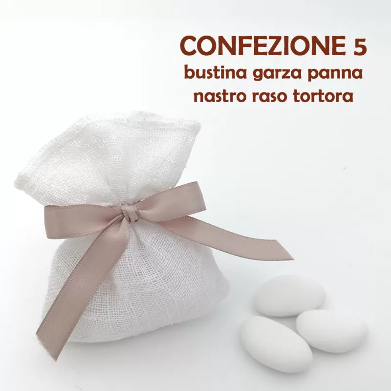 Possibilità di scegliere la confezione con scatola chiusa con nastro di colore a scelta e sacchetto con 5 confetti all'interno, o porta confetti trasparente.