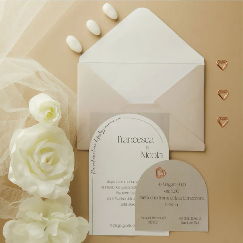 Per completare il coordinato evento in modo pratico e armonioso, nel prezzo sono incluse anche le partecipazioni, che ti arriveranno da assemblare, comprensive di: