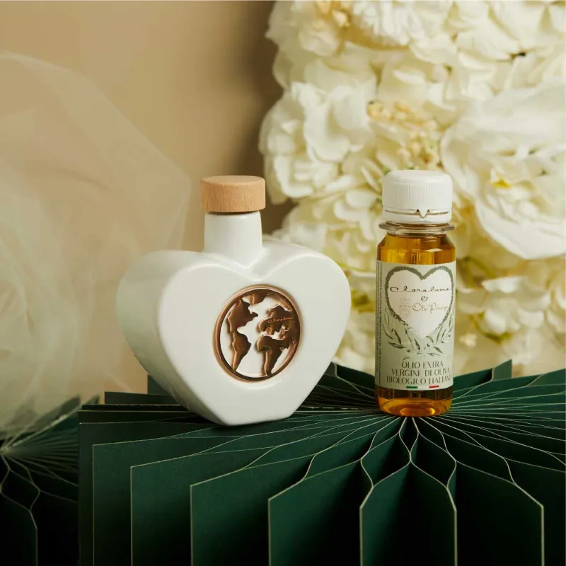 La bomboniera matrimonio Claraluna 2026 oliera a cuore tema viaggio con mondo oro rosa è pensata per gli sposi che sognano un amore senza confini e desiderano bomboniere matrimonio utili, eleganti e dal forte significato simbolico. Il design Claraluna unisce la forma romantica del cuore al dettagliato decoro del mappamondo in finitura oro rosa: un abbraccio tra amore e viaggio che racconta la vostra storia, i viaggi fatti insieme e quelli che farete da marito e moglie.