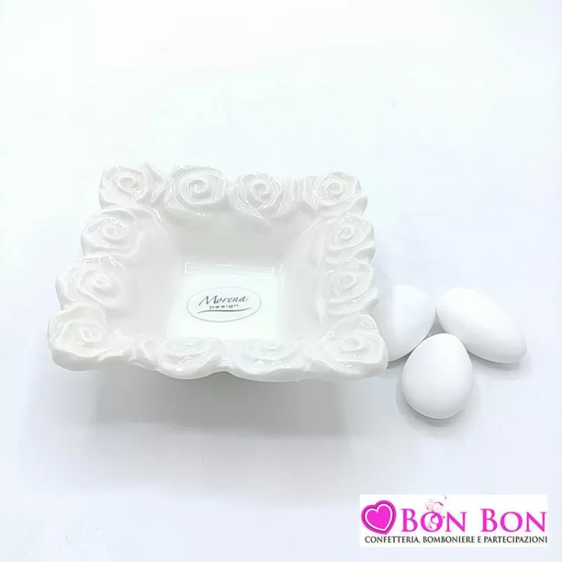 Bomboniera matrimonio piattino quadrato con fiori porcellana bianca.