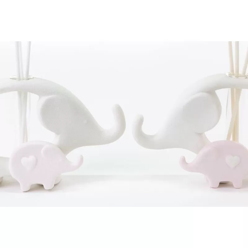 Bomboniera nascita e battesimo profumatore elefanti in porcellana bianco e rosa completa di astuccio panna e essenza le stelle.