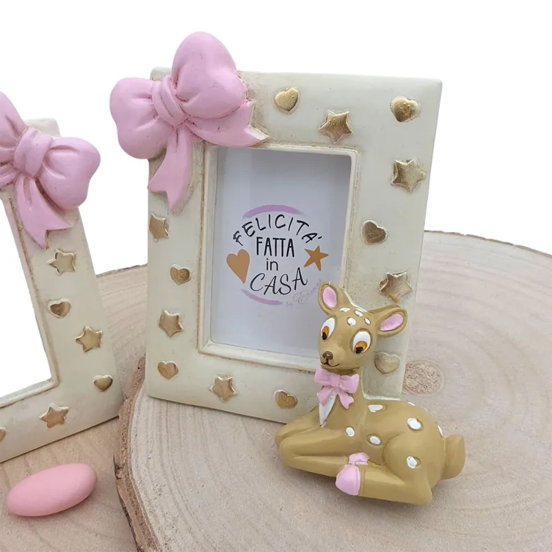 Celebra i ricordi più dolci con il portafoto con cervo in resina rosa – Linea Tenero, una bomboniera utile e raffinata per nascita, battesimo e primo compleanno. La cornice color avorio è impreziosita da stelline e cuori argentati in rilievo che illuminano la foto, mentre nell’angolo inferiore è adagato un dolce cerbiatto con fiocco rosa e dettagli curati a mano.