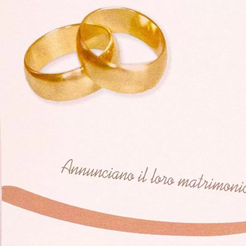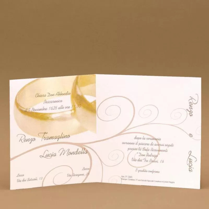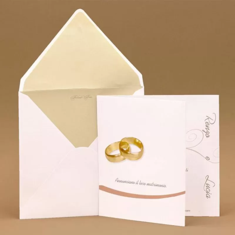 Partecipazioni di nozze quadrata 15x15 cm con fedi sull'esterno, nomi degli sposi laterali,chiusura a fisarmonica e invito incluso e busta a taglio punta.