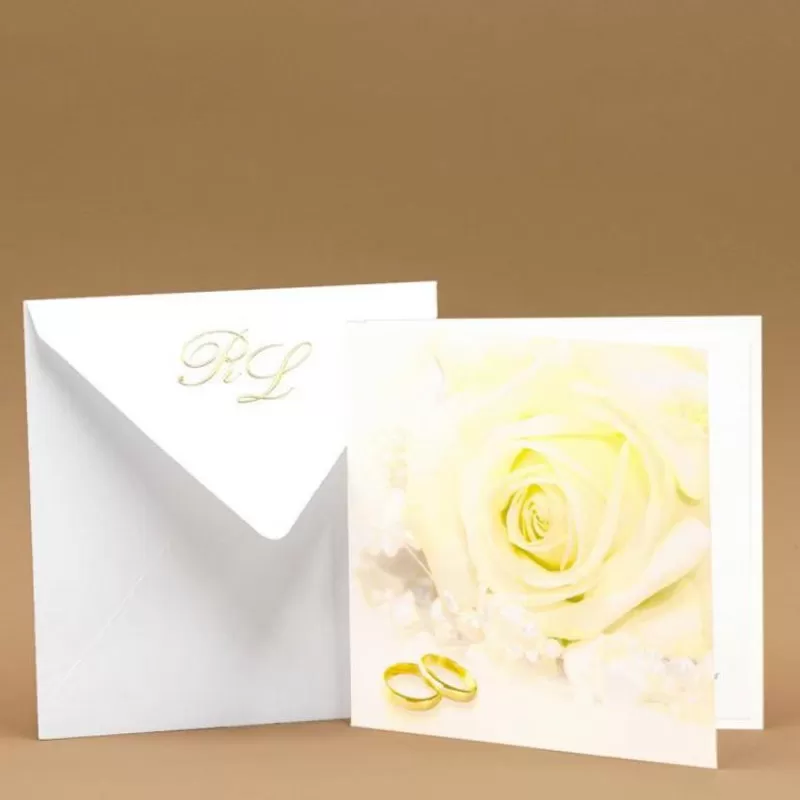 Partecipazioni di matrimonio quadrata 15x15 cm chiusa, con rosa bianca e fedi sulla copertina, con invito incluso e busta quadrata a taglio punta.