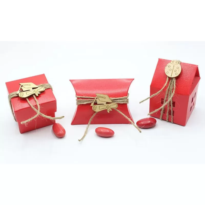 Casetta portaconfetti in cartoncino rosso e applicazione coccinella in legno confezionato con 5 confetti a scelta avvolti nel velo inseriti all'interno dell'astuccio.