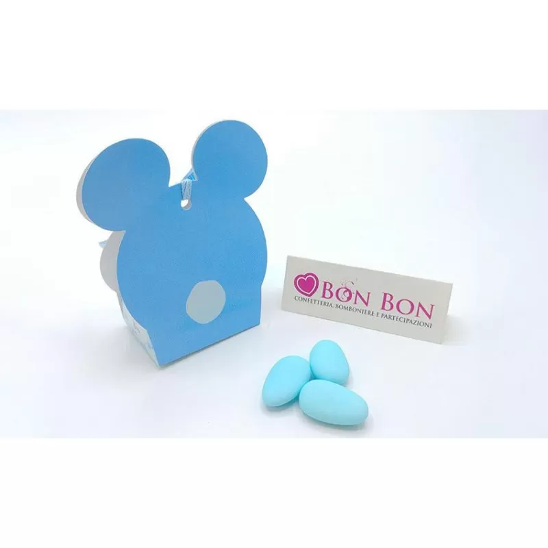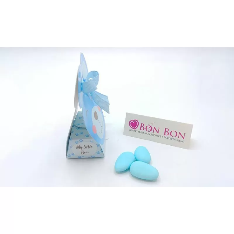 Scatoline portaconfetti orsetto celeste in cartoncino confezionata con 5 confetti a scelta inclusi nel prezzo chiusa con fiocco nastro celeste.