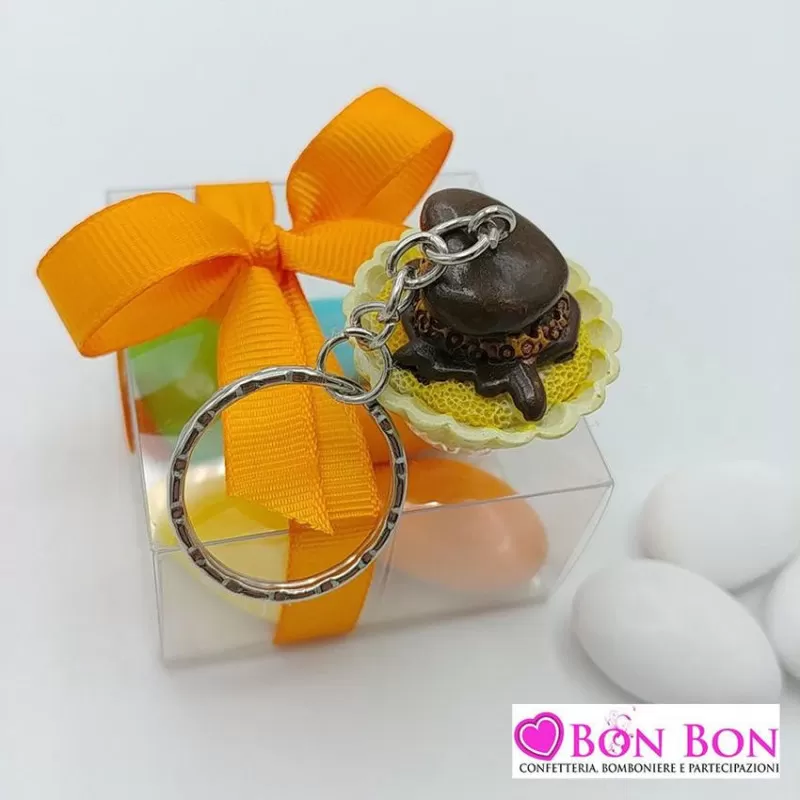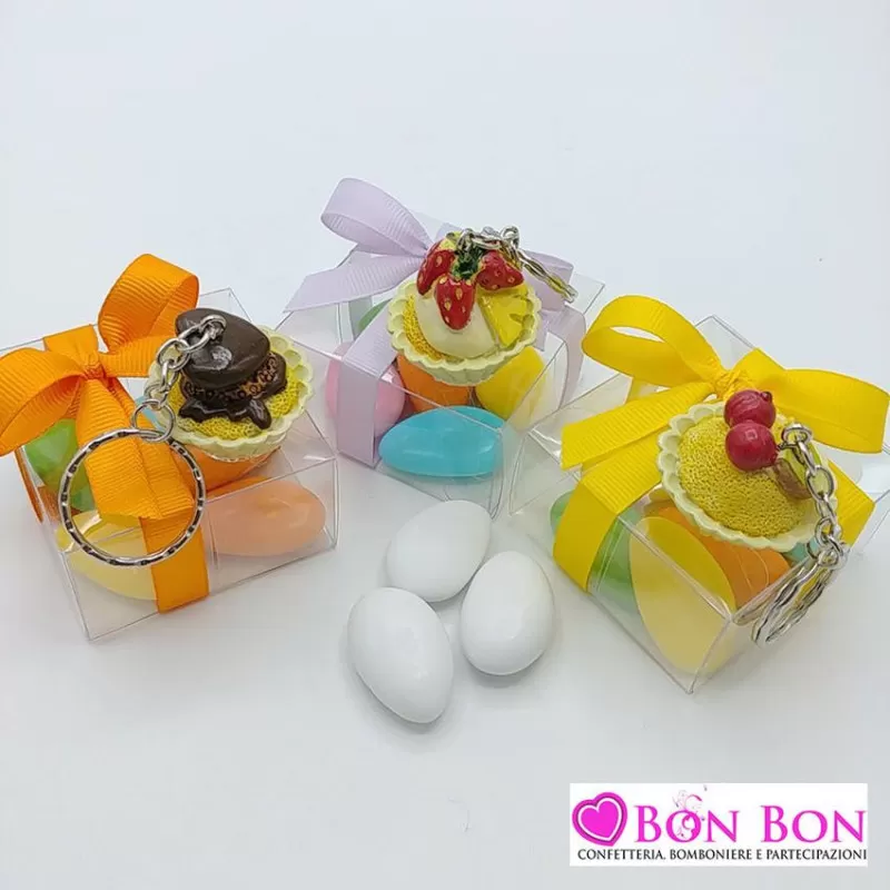 Bomboniera in offerta prima comunione portachiave tortina assortita confezionato con scatolina trasparente con 5 confetti a scelta.