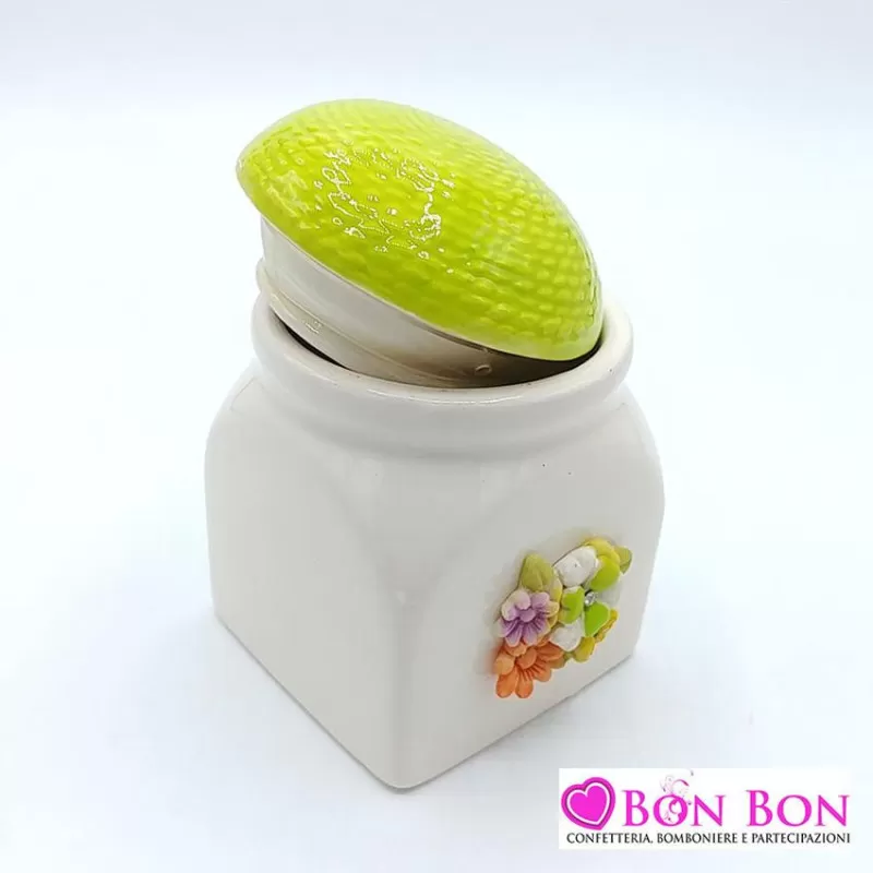 Bomboniera prima comunione barattolo in porcellana con applicazione fiore 4 colori assortiti senza astuccio.