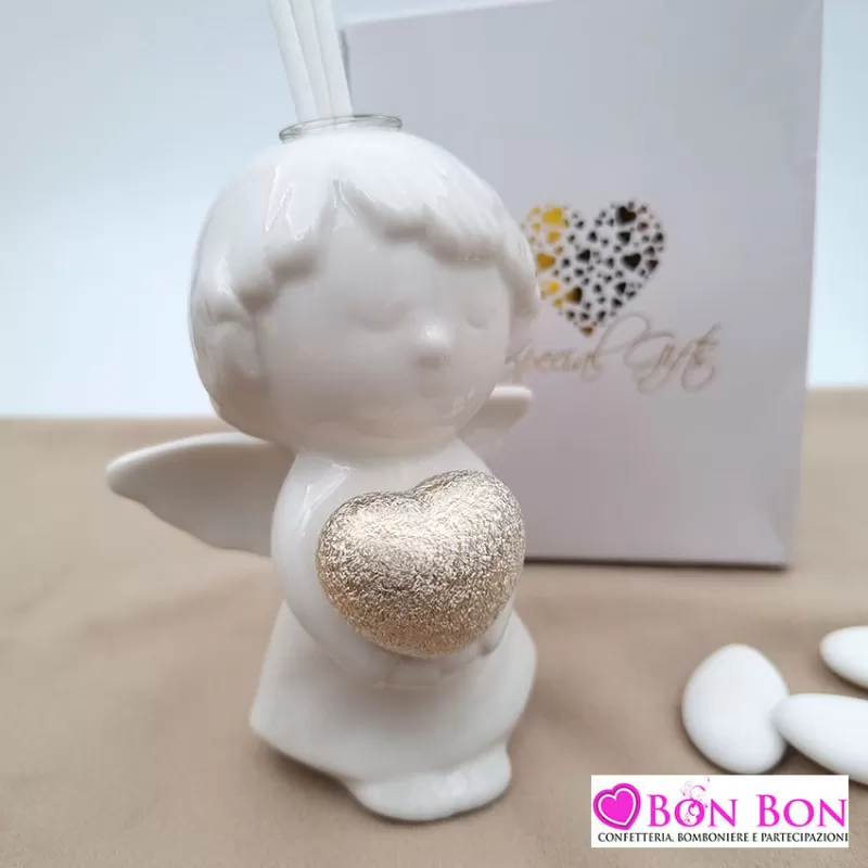 Bomboniera prima comunione profumatore angelo cuore in oro, incluso di astuccio.