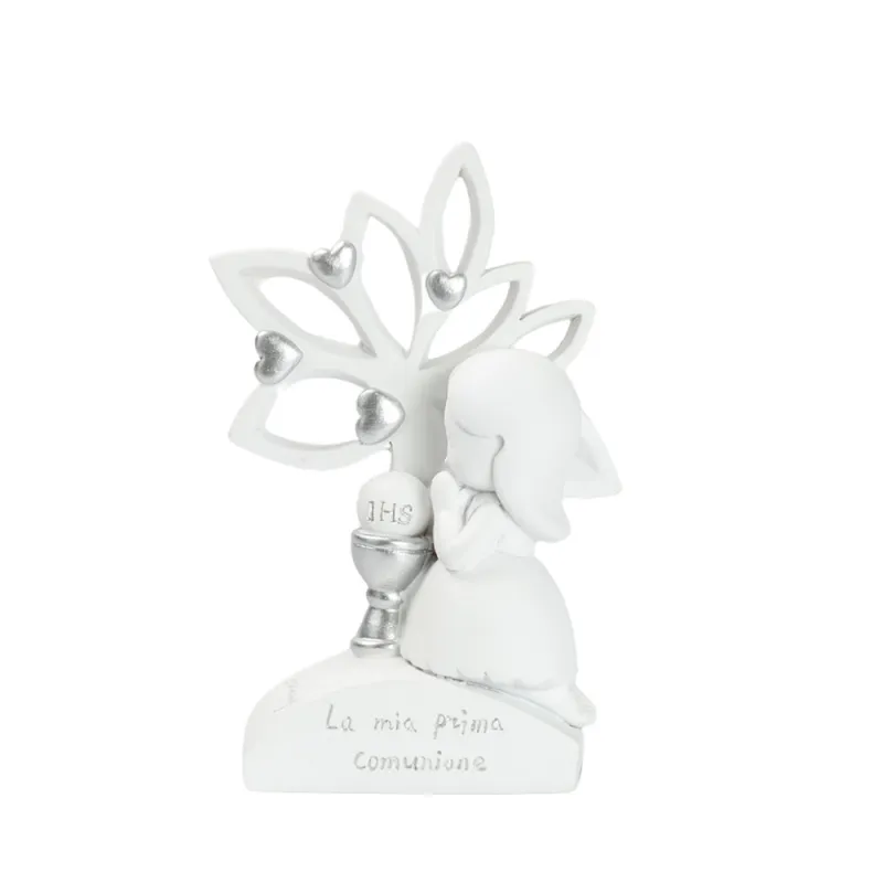 La bomboniera raffigura una bimba in atteggiamento di preghiera, accanto al calice con scritta JHS, con la frase “La mia prima comunione” incisa alla base. Sullo sfondo spicca l’Albero della Vita, decorato con piccoli cuori e dettagli argento: un tocco luminoso che valorizza l’oggetto e lo rende perfetto per una cerimonia dal gusto classico o moderno.
