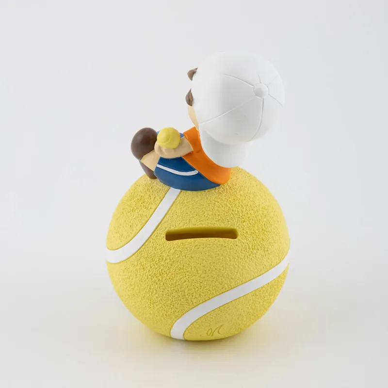 Bomboniera Prima Comunione salvadanaio tennista in resina a forma di palla da tennis, ideale per bambini sportivi, con possibile confezione con confetti.