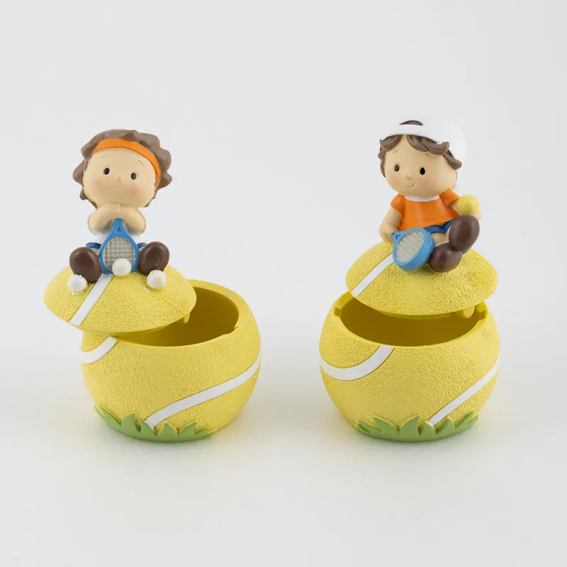 Sulla parte superiore della palla è applicato un simpatico tennista in resina, decorato con racchetta e pallina, disponibile in 2 soggetti assortiti: il bimbo seduto con fascia e racchetta e il bimbo con cappellino e racchetta pronta al servizio. Le espressioni dolci e i colori vivaci rendono questa bomboniera tennista una scelta ideale per Prima Comunione, cresima o feste a tema sportivo.