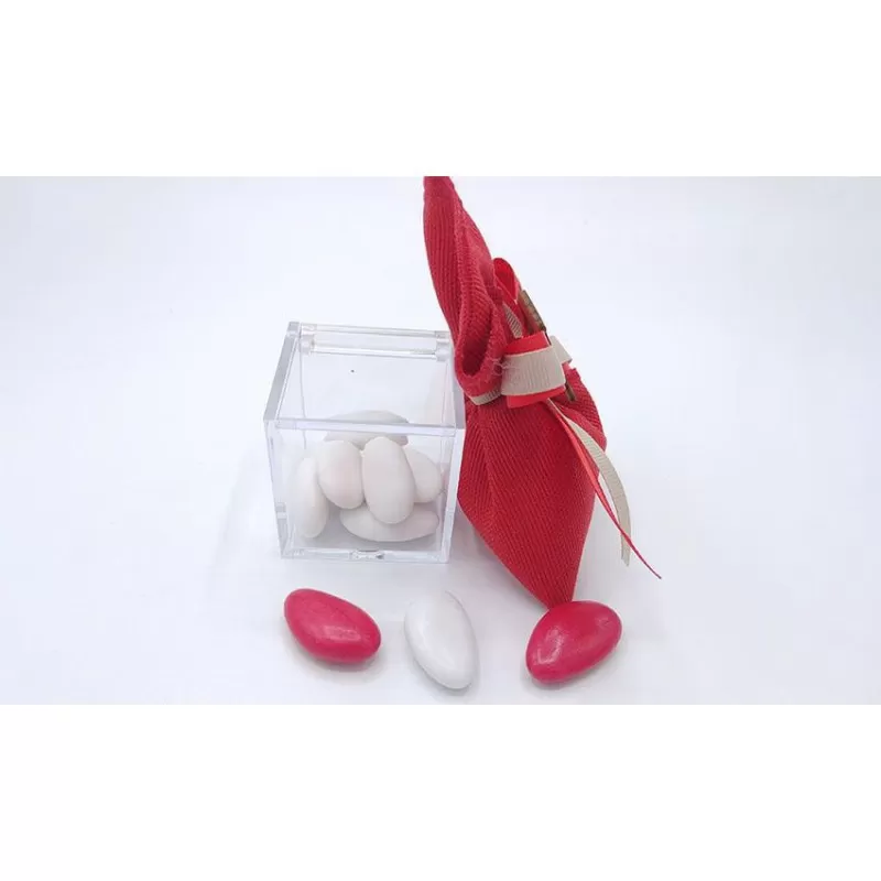Busta incrocio di cotone panama rosso incluso di 5 confetti a scelta con applicazione tocco e pergamena in legno