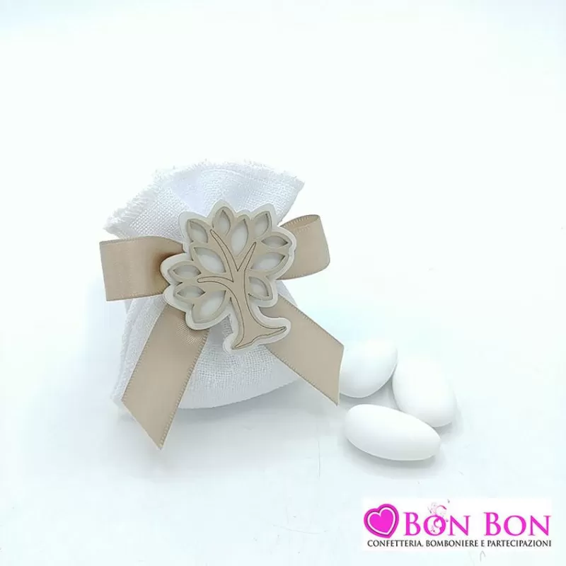 Sacchetti matrimonio porta confetti in tessuto maiori bianco confezionati con fiocchi raso tortora e panna, applicazione albero della vita (G3599) in legno e 5 confetti a scelta.