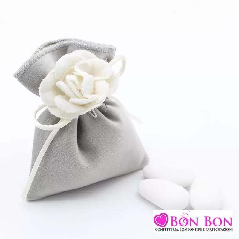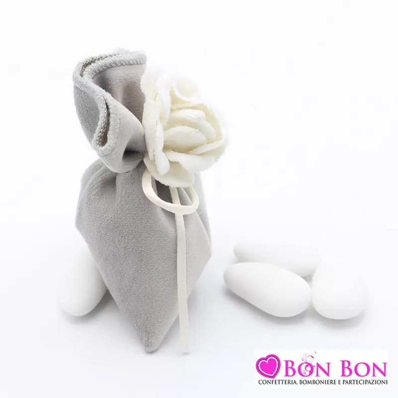 Sacchetti matrimonio porta confetti in velluto colore grigio confezionati con fiocchi in raso panna e cordicina liscia avorio, rosellina panna in velluto con all'interno 5 confetti a scelta avvolti nel velo.