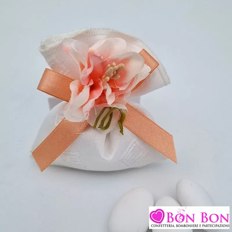 Linea sacchetti porta confetti per matrimonio in raso bianco con logo Carlo Pignatelli confezionati con fiocco in raso color pesco e fiore con pistilli pesco (ck8103) con all'interno 5 confetti a scelta.
