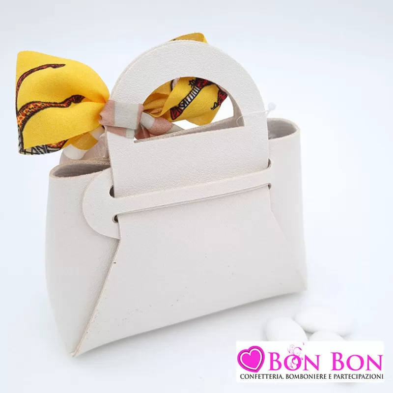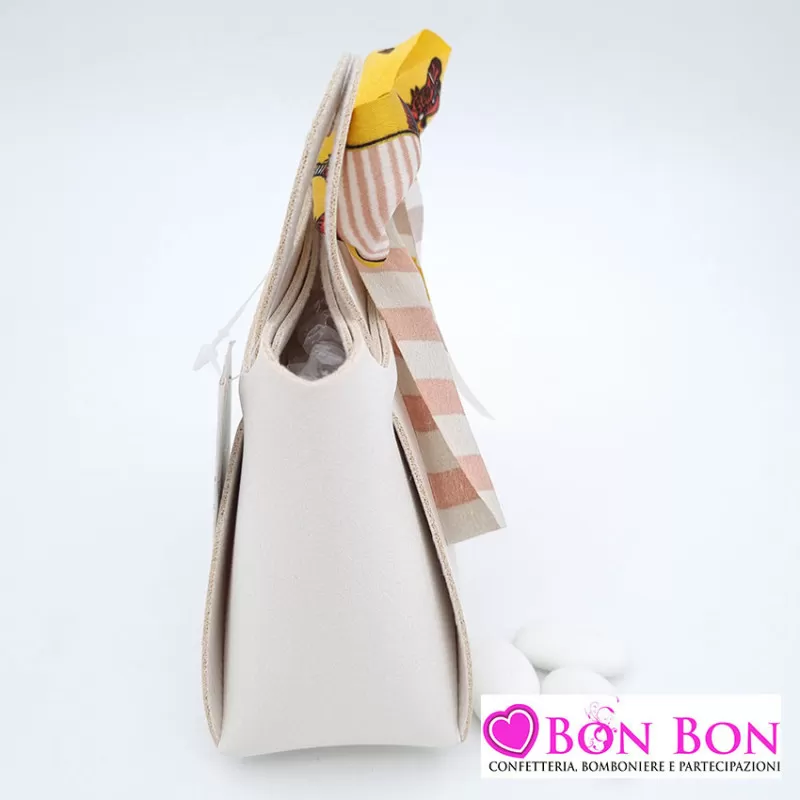Sacchetto matrimonio borsetta in ecopelle panna confezionata con fiocco sul manico e 5 confetti a scelta che verranno avvolti nel velo inseriti all'interno della borsetta.