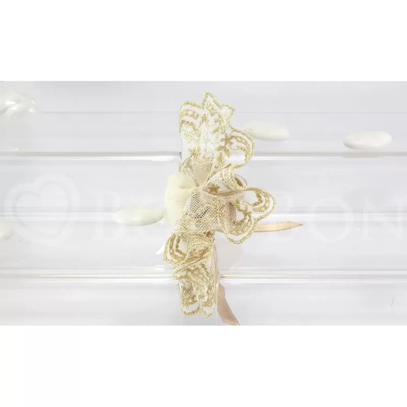 Centrino in lino panna e merletto di tulle ricamato confezionata con 5 confetti a scelta avvolti nel velo.