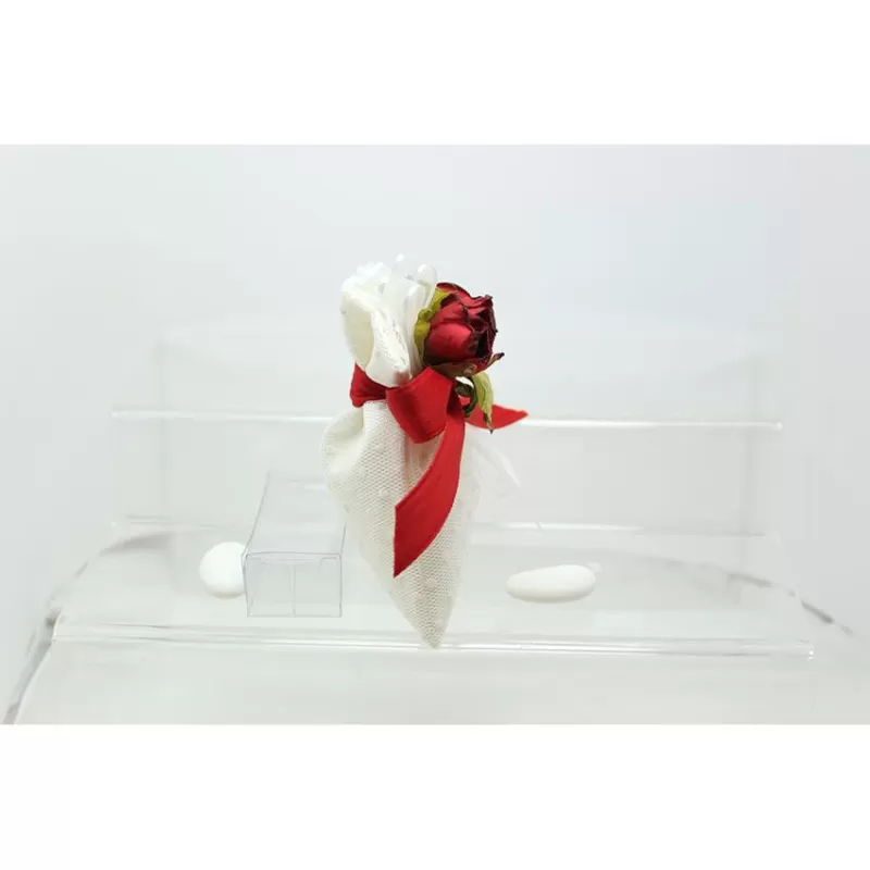 Sacchetto piccolo raso rivestito tulle pois confezionato con 5 confetti a scelta avvolti nel velo.