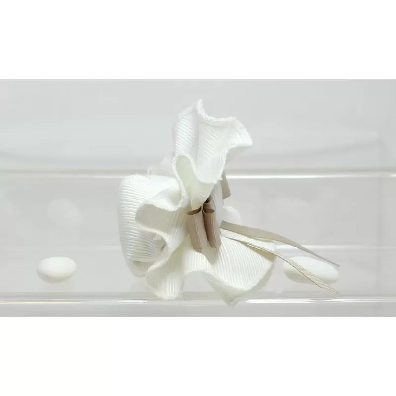 Centrino ottomano avorio con bottone confezionata con 5 confetti a scelta avvolti nel velo.