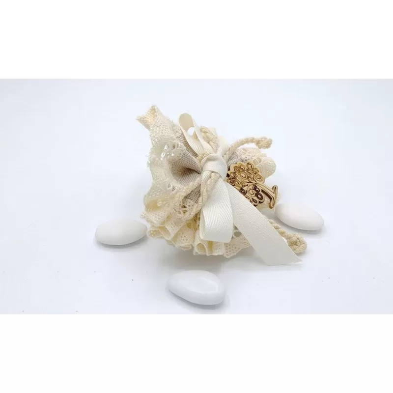 Sacchetto matrimonio centrino country pizzo e cotone confezionato con 5 confetti a scelta e applicazione albero della vita in legno