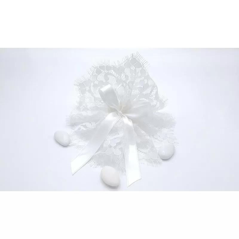 Sacchetto matrimonio centrino piccolo lino e valencienne bianco incluso di 5 confetti a scelta