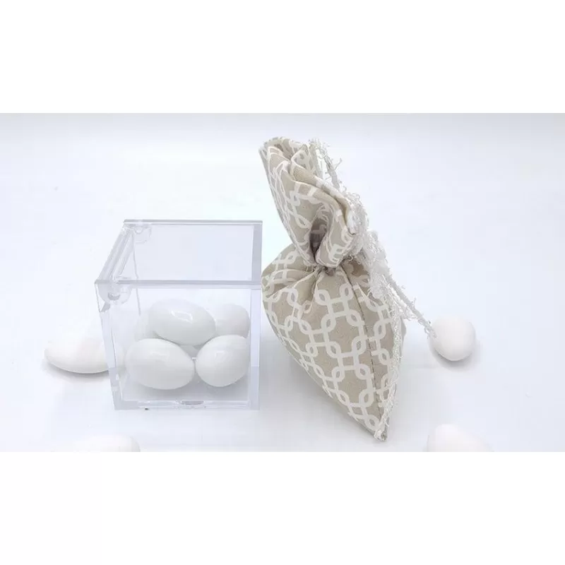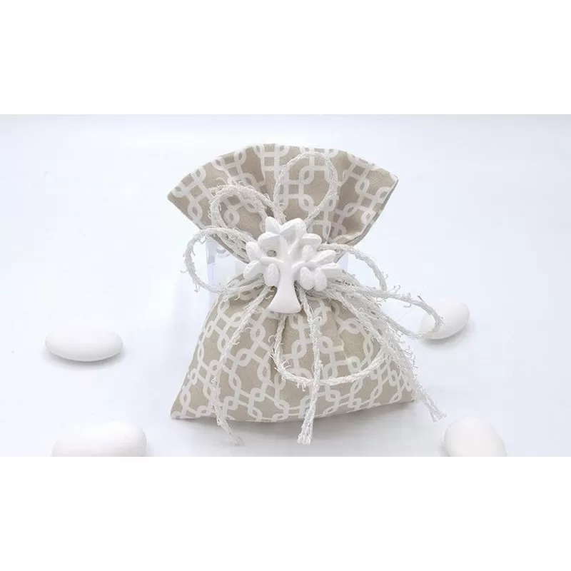 Sacchetto matrimonio sacchetto medio di cotone fantasia geometrica tortora con 5 confetti a scelta e applicazione gessetto albero della vita