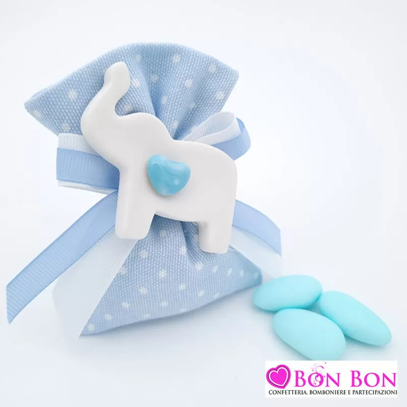 Sacchetti per nascita e battesimo linea cotone celeste pois bianchi, confezionati con doppio fiocco bianco e celeste con magnete elefante in porcellana con cuoricino azzurro, compreso di 5 confetti a scelta.