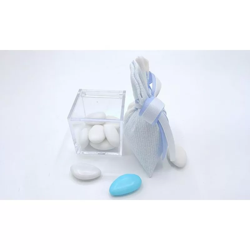 Sacchetto medio nascita e battesimo di cotone fantasia panama fiocco celeste con 5 confetti a scelta.