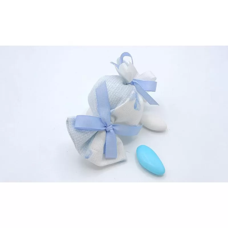 Caramella nascita e battesimo di cotone fantasia panama fiocco celeste con 5 confetti a scelta.
