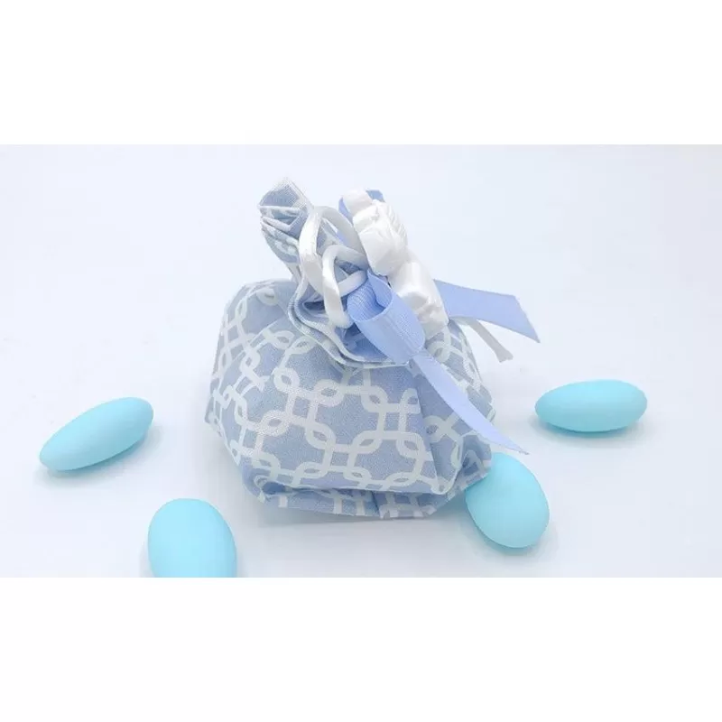Sacchetto nascita e battesimo fagottino di cotone fantasia geometric celeste con 5 confetti a scelta e applicazione gessetto cicogna.