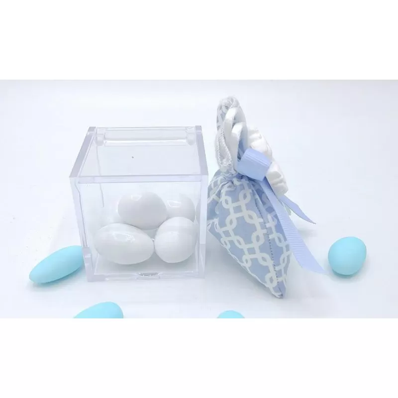 Non dimenticare di salvare la tua personalizzazione per poter riempire il carrelloSacchetto piccolo nascita e battesimo di cotone fantasia geometric celeste con 5 confetti a scelta e applicazione gessetto cicogna.