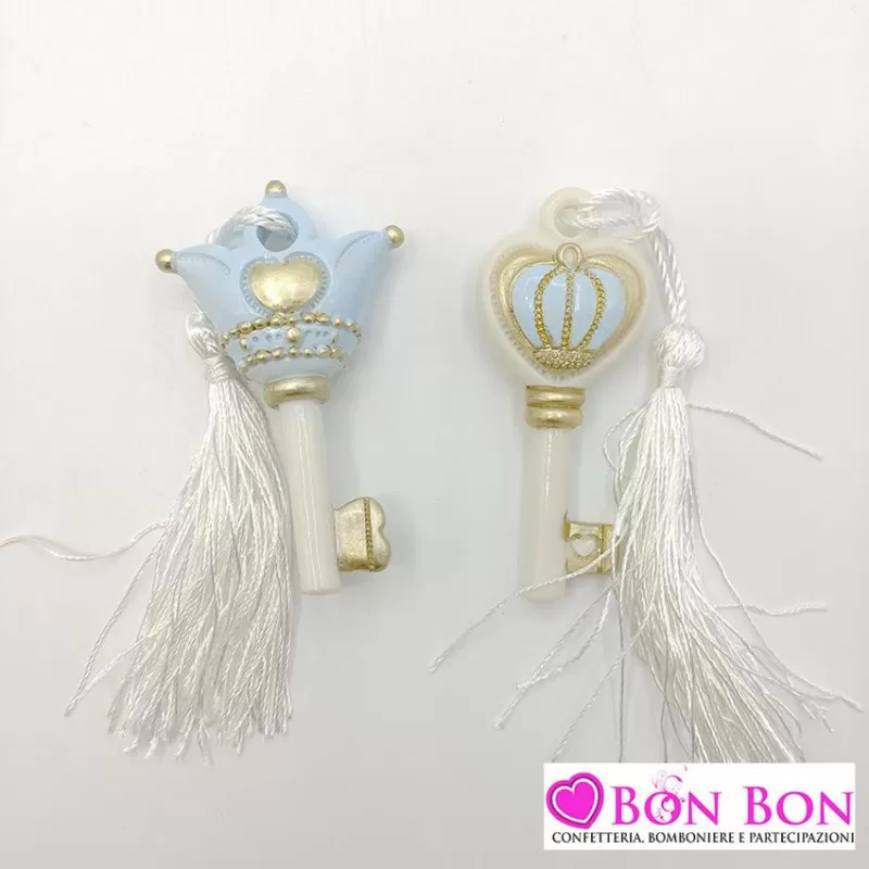 Sacchetto nascita e battesimo con magnete chiave 2 assortiti confezionato con 5 confetti a scelta.