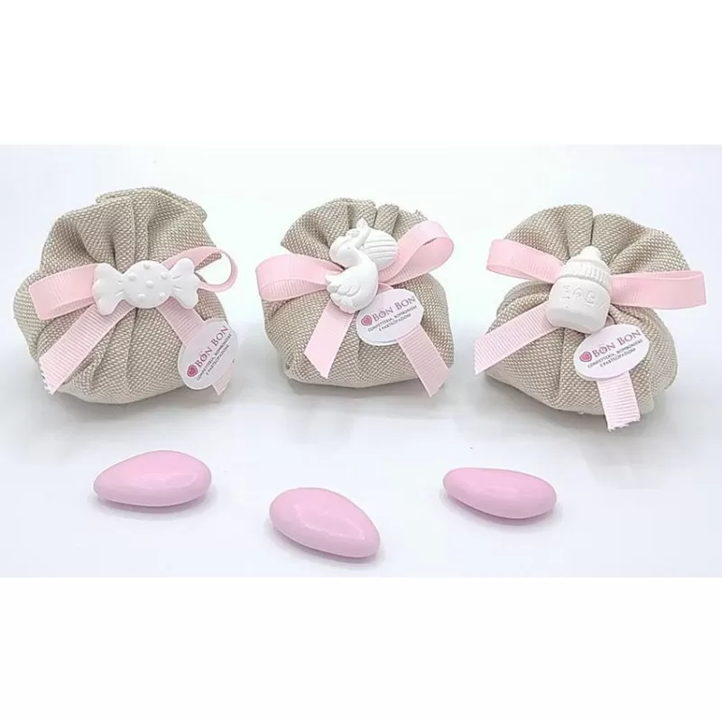 Fagotto tela mare con all'interno 5 confetti a scelta e gessetto assortino nascita da scegliere in opzione.
