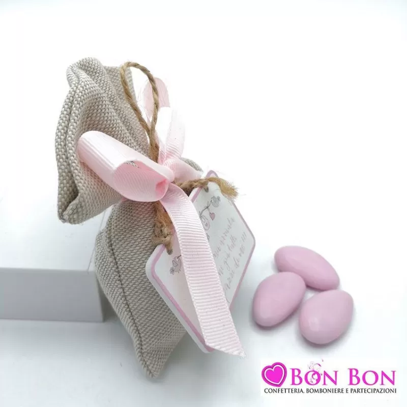 Sacchetto nascita e battesimo tela mare con targhetta in legno bimba confezionato con 5 confetti a scelta.
