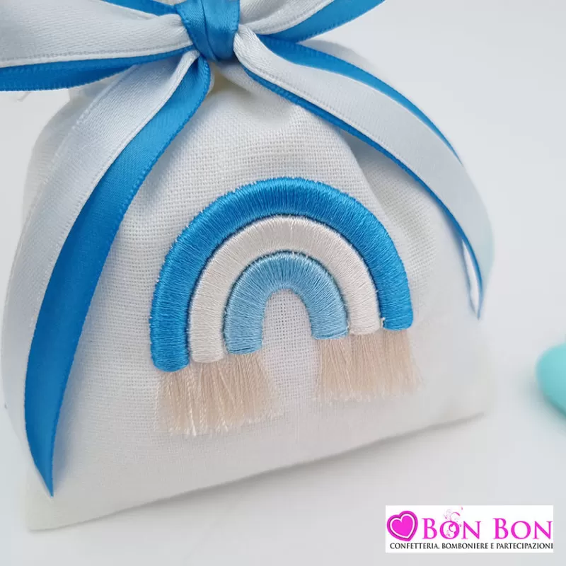 Sacchetto per battesimo busta in cotone bianco con applicato arcobaleno celeste ricamato, confezionato con doppio fiocco in raso avion e bianco con all'interno 5 confetti a scelta avvolti nel velo.