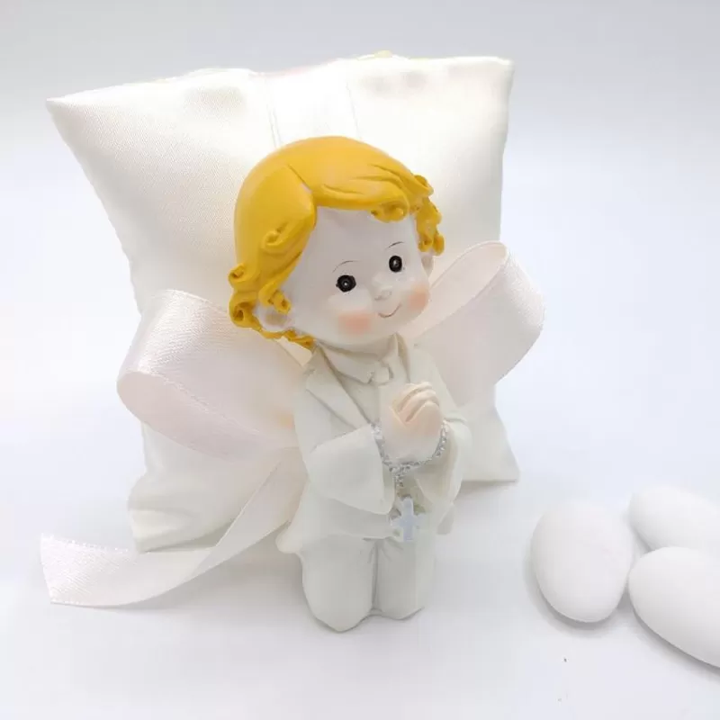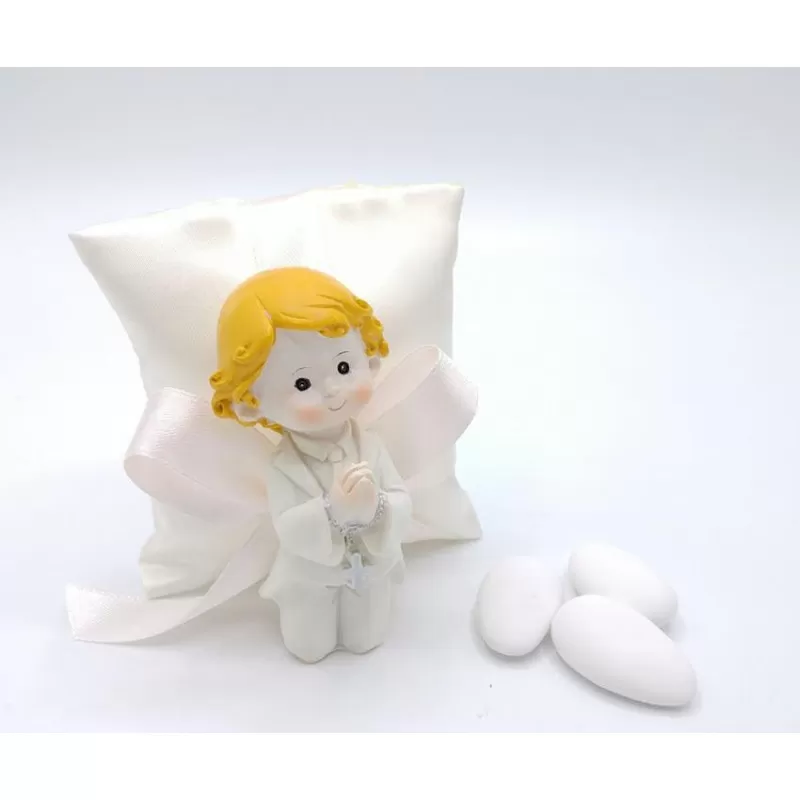 Cuscinetto raso avorio con bimbo che prega in resina colorata confezionato con 5 confetti gusto a scelta.
