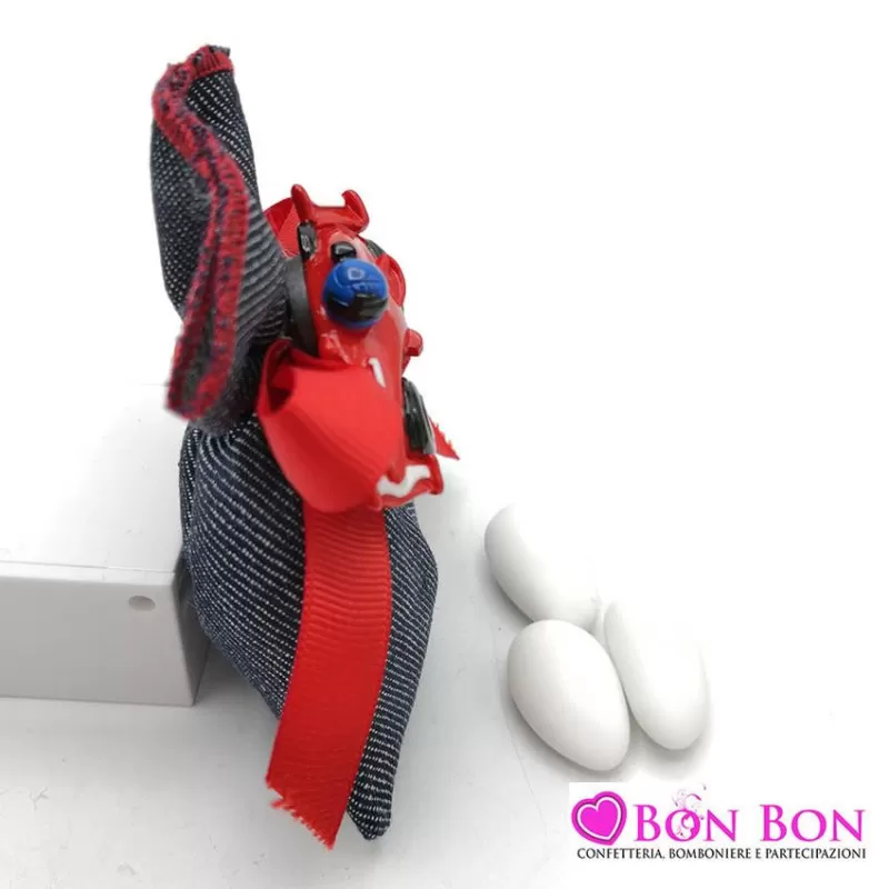 Sacchetto prima comunione tessuto jeans con magnete formula 1 rossa confezionato con 5 confetti a scelta.