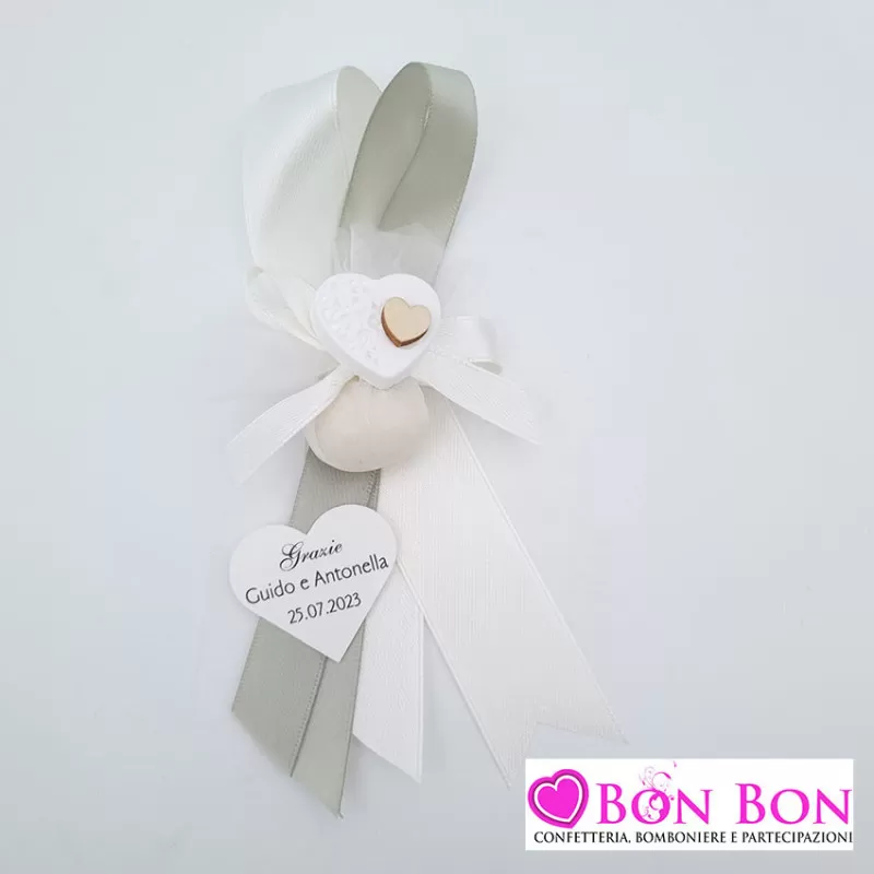 Segnaposto matrimonio con confetto a scelta avvolto nel velo, con nastri bianco e verde salvia, gessetto cuore con legno e tag cuore personalizzato con i nomi degli sposi.