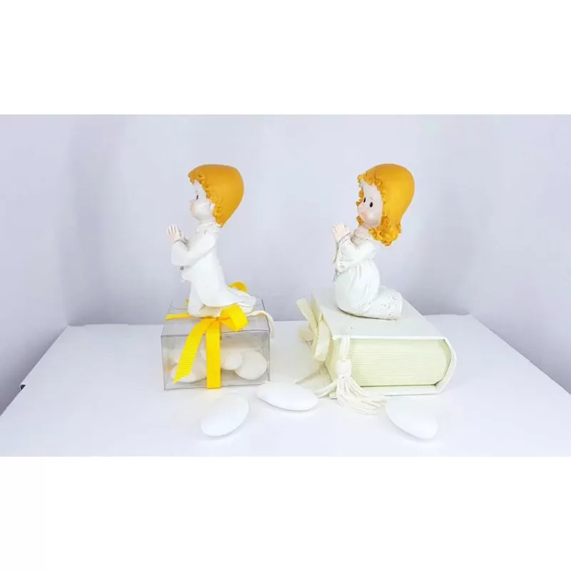 Bimbo prima comunione con astuccio portaconfetti trasparente, con possibilità di sostituirlo con il libro portaconfeti avorio in foto.